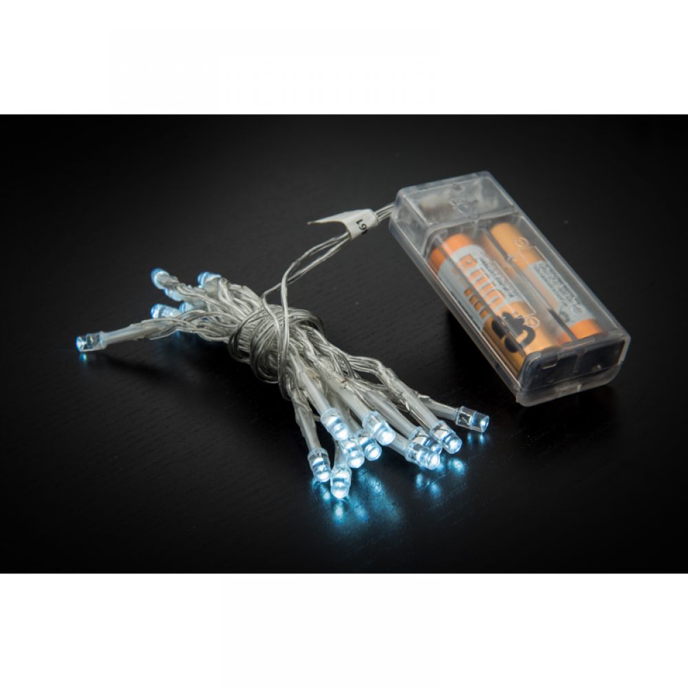 Λαμπάκια μπαταρίας led με σταθερό φως. Διάφανο καλώδιο με λευκό του πάγου φως. Εχει 20 led λαμπάκια ,ανα 5εκ, συνολικό μήκος 1 μέτρο. Λειτουργεί με 2x2A μπαταρίες που ΔΕΝ περιέχονται.