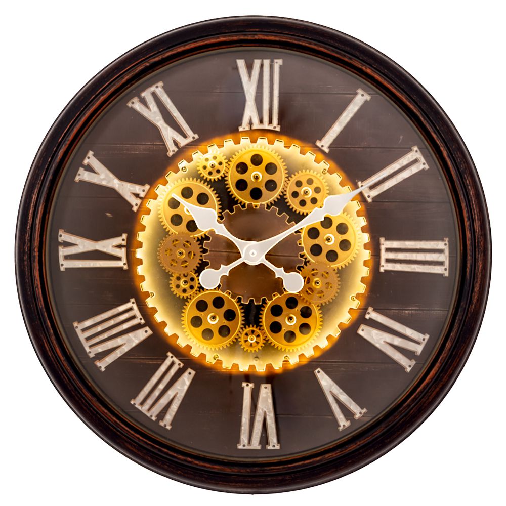 Ρολόι τοίχου με φώς 57εκ πλαστικό καφέ με γρανάζια με ασύρματη σύνδεση με επιλογή 3 χρωμάτων.